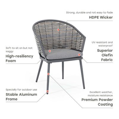 Размеры продукта | Тип:Алюминиевый набор для столовой на улице Рама:Алюминий Материал: ротан из смолы Размер стула: 24'D x 24"W x 32"H Масса стула: 23 фунта Вес стула: 250 фунтов. Размер стола: 35"D x 35"D x 28"H Масса стола: 25 фунтов Вес стола: 110 фунтов |